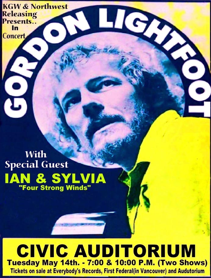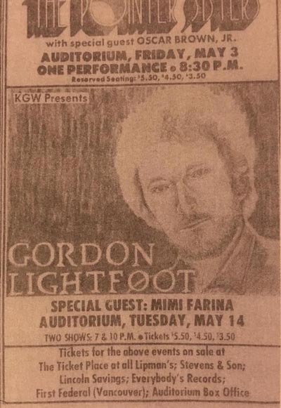 Two ads for May 14, 1974, opening for Gordon Lightfoot at the Civic Auditorium in Portland.