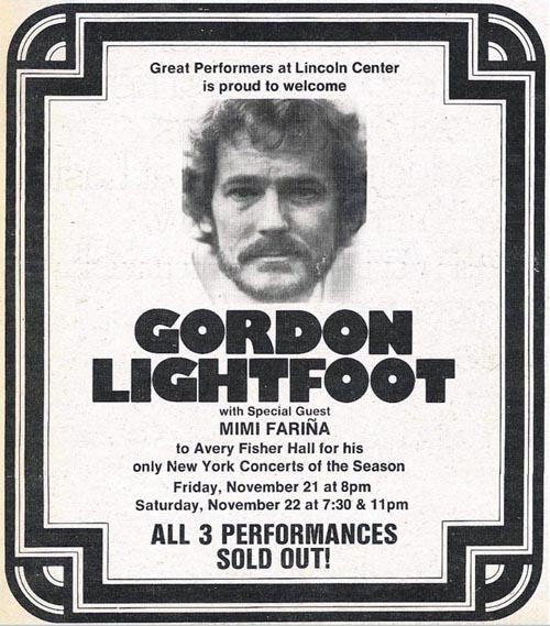 Opening for Gordon Lightfoot at Avery Fisher Hall at Lincoln Center, New York City,