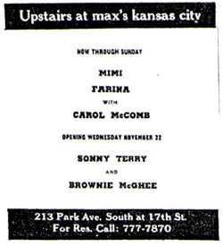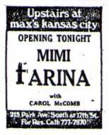 Mimi with Carol McComb at Max's Kansas City, NYC, Nov. 15-19, 1972. Ads from The New York Times.