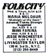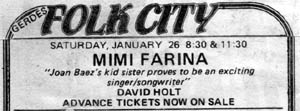 Mimi at Folk City, January 26, 1985. David Holt opens.