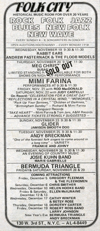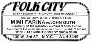 Mimi & Banana at Folk City, May 9, 1981. Guthrie Thomas opens.