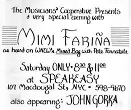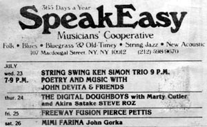 Two ads for Mimi at the Speakeasy, NYC, Saturday, July 26, 1986. John Gorka opens. Once again, Pete Fornatale is the MC.