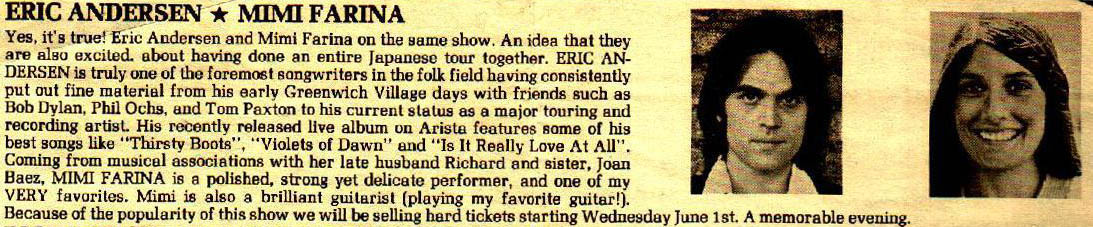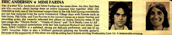 An ad for Mimi and Eric Andersen playing in the U.K.