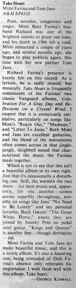 a new partner, songwriter Tom Jans, and the result is TAKE HEART (A&M), a kind of