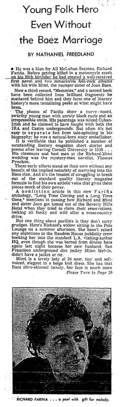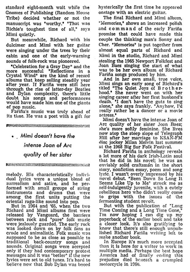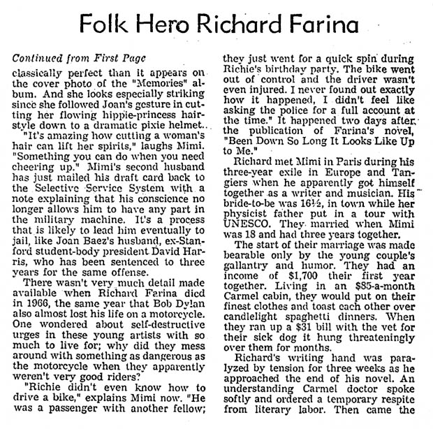 It's always great to find a positive article like this about our favorite folk duo, who were never much favored by the press. Despite an obvious error in the first paragraph (Richard died on Mimi's 21st birthday, not his own 29th birthday), I think this one is worth pulling out of the vaults.