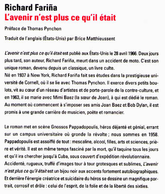 This edition also has the Thomas Pynchon introduction. This is the third translation of Richard Fariña's novel. The title literally means, "The future isn't what it used to be."