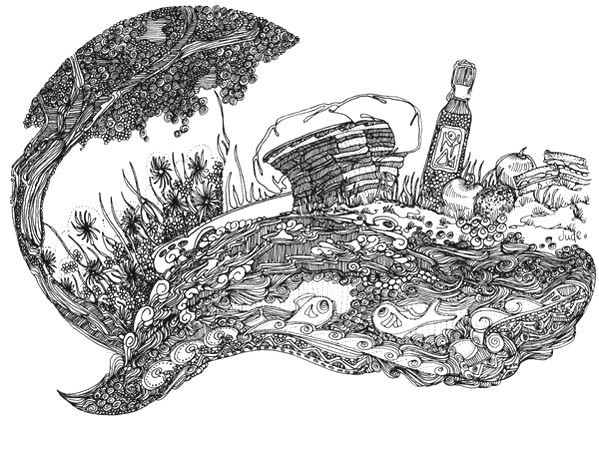 This is a book of sheet music in tablature for the three-string dulcimer. It's not a book for the beginning dulcimer player, though it does have some explanation of modes and tuning. It covers 22 Fariņa songs, including not only the dulcimer- driven instrumentals but also some of the more guitar-oriented songs, arranged by the authors for dulcimer, or with suggestions on how to tune the dulcimer to accompany certain songs (such as "House Un-American Blues Activity Dream"). Lyrics are included for all songs with lyrics. So even if you don't play the dulcimer, you can still get the lyrics, and the beautiful illustrations by Jude Goodwin. I've included one of them below, so you can see what her style is like.