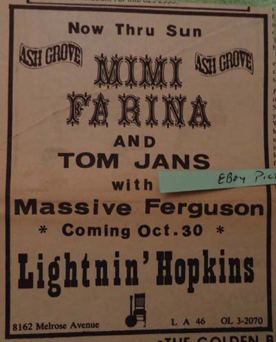 Massive Ferguson opened for Mimi and Tom Jans at the Ash Grove gig in LA in 1970. There were 3 more gigs we did together on that "tour"-- all promoted by Jim Jenkins, the owner of a now-long gone folk club in San Clemente, CA called The Four Muses. Jim Jenkins provided beachside apartments for my band and Mimi and Tom during this brief "tour" period. Of course we played there at The Four Muses, then at an equally obscure club now gone called In The Alley in Escondito, CA. The last gig we did with Mimi and Tom was at The Back Door, a coffee house on the UC campus in San Diego, where Massive Ferguson often opened for Ian Matthews, Eric Anderson and others. I was in the hospital when Massive Ferguson started the gig at the Ash Grove. The other band members knew what a crush I'd always had on Mimi and dared me to survive so I could make it to the last night of the gig, which I did.