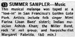 Summer Sampler: Music in Golden Gate Park August 24, 1967 Produced by KQED San Francisco. This one-hour black-and-white show featured Mimi Fariña, Margaret Fabrizio (a harpsichordist), Ashish Kahn (a sarodist), and Quicksilver Messenger Service. The New York City area T.V. Guide listed "the Miller Band" instead of QMS, but this is not corroborated by other sources. Thomas McKean, a long-time Fariña fan who saw this on television in NYC, recalls that Mimi performed two songs: Dino Valenti's "Get Together" and Tuli Kupferberg's "Morning, Morning" (which she also performed with Joan at the 1968 Newport Folk Fest). I don't know if this film still exists. |