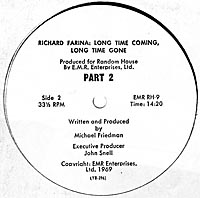 Long Time Coming and a Long Time Gone Written and produced by Michael Friedman. EMR Enterprises (EMR RH-9) 1969. This was a spoken word recording of some of Fariña's writings interspersed with interview segments with Mimi, which are different from the ones that appear as introductions to the selections in the book Long Time Coming and a Long Time Gone. This was not a commercial release; it seems to be a promotional kit for radio stations to create buzz for the book. The only known copy of this record is in the Library of Congress.