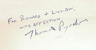At right is Thomas Pynchon's signature, written inside a copy of his first novel,