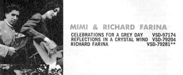 Vanguard used to include mini-catalog pamphlets in their LPs, and the Fall, 1968 catalog (pictured at right) listed three albums in the Mimi & Richard section, the third one being Richard Fariña (see below). This may have been a tentative title for the album that eventually became Memories. The stock number for Memories was VSD-79263, while the one listed here is VSD-79281. (The catalog explains elsewhere that ** stands for forthcoming.)
