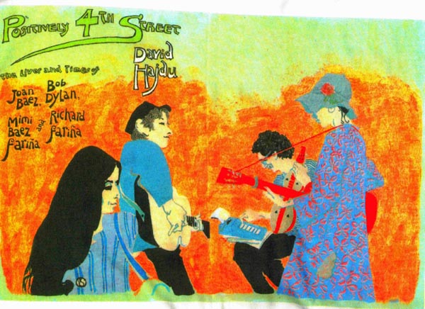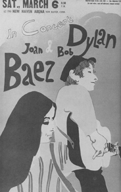 This may be the most perfect book jacket ever published. The front is based on a poster von Schmidt created for Baez and Dylan's 1964 tour (depicted below). The poster was in turn based on a photo by Dick Waterman taken at Club 47. Eric attempted to design the illustration and lettering in such a way that neither Baez nor Dylan would appear to outshine the other: Joan appeared first (if you're looking left to right) but Dylan appeared higher, so they were each given equal prominence, equal billing. The front cover of the book, therefore, portrays a clash of egos and draws the reader in with the star status of Baez of Dylan. When the reader closes the book, however, he finds that he has really been reading about Richard and Mimi Fariņa, the great folk-rock innovators who have been all but forgotten by history and relegated to "the back." |