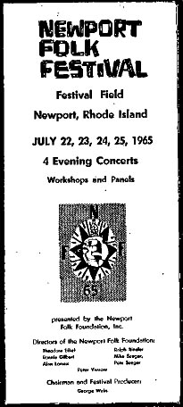 The illustration, shown right, is of the front cover from a small leaflet given away at the 1965 Newport Folk Festival. On its inside page, it listed all the performers scheduled for the four evening concerts, plus the Sunday afternoon and the Sunday morning shows. |