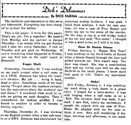 Brooklyn Tech did have a literary magazine, Horizons, but Fariña seems not to have been involved with this publication, as he surely would have included it among the distinctions listed in his yearbook. His own column in The Survey apparently gave him the creative forum he needed. I have not found any issues of the Science Bulletin, to which Fariña also contributed.