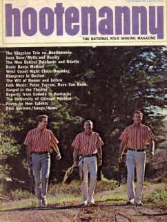 Collector Advisory: It seems there were two different magazines titled Hootenanny in the heady days of the folk revival. One magazine was a tie-in for the ABC television show of the same name (the one that refused to feature Pete Seeger). The ABC magazine had cheap drawings and gaudy photo collages, and it only covered artists who appeared on the show. The other Hootenanny magazine, subtitled The National Folk Singing Magazine, was a more legitimate publication, edited by Lynn Musgrave (from Boston Broadside) and Robert Shelton. Shelton's magazine only lasted four issues; the ABC Hootenanny lasted only three issues. Make sure you get the one with the Kingston Trio cover (pictured at left) if you're looking for the issue with "The Ballad of Joan Baez." |