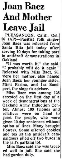 ![]() Big Joan, Joan and Mimi are released from Santa Rita Prison October 27, 1967, after serving ten-day sentences for protesting the draft at an Army Induction Center. Left to right: Albert Baez, Joan Baez Jr., Pauline Marden, unidentified woman, Joan Bridge Baez, Mimi Fariña. From Joan Jr.'s autobiography, And a Voice to Sing With, Summit Books, 1987. Article from Washington Post, Oct. 27, 1967, p. A3.