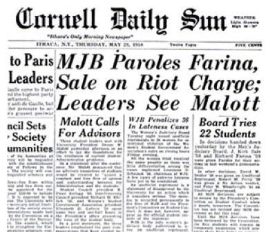 Toward the end of his third year, Fariña participated in a student protest against the repressive regulation of co-eds on campus. Kirkpatrick Sale, a friend of Richard and leader of the protest, says that Fariña was actually indifferent to campus politics and exaggerated his involvement in the protest. All to good effect, however, for he managed to get himself suspended for the incident, and his name appeared in newspapers across the country. Years later the incident became a Cornell legend, and Fariña used the events for the climax of his novel. He returned to Cornell in the Fall, but he dropped out toward the end of his senior year in 1959. |