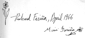 Further details of Richard's high school years may be found on the Brooklyn Tech page, and his Cornell friends are having a reunion on the Cornell page. Further probings are attempted in my essay on the novel, and sundry facts are strewn all over the website in a madcap attempt to grasp, approximate, comprehend, capture, record for posterity this fascinating individual. Perhaps Richard Fariña's greatest creation was his own enigmatic, beguiling, bullshitting, charming self. He re-invented his own life as radically as he re-invented the art of the dulcimer. But his stories and poems, his novel, and above all, that marvelous music, reveal his inner spirit's song better than this poor narrative can, and it is there I bid you go. Olé.